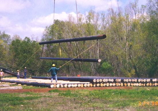 Lancaster’s in-house designers, with strong engineering support from Whitney, Bailey, Cox and Magnani, Baltimore, MD provided the technical drawings and design calculations. Lancaster production superintendents and QC technicians supervised the piling fabrication to assure final performance of the piling delivered to the project site. The project consists of self-supporting fender walls that sweep in and out of the draw bridge bascule under the Lake Pontchartrain Bridge. The three and five pile support clusters will be spaced eight feet on center and are connected with ten horizontal wales that run the length of the fender walls. Recycled plastic lumber wales are spaced twenty inches on center and act as the fender element. All is tied together with stainless steel cable and fittings.